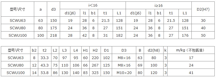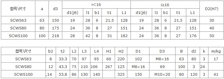 SCWO型減速器I、II裝配型式主要尺寸 /mm